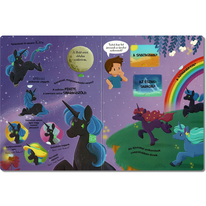 Szerinted léteznek unikornisok? És valóban varázserejű a szarvuk? Hogyan élhetnek, hol játszhatnak ezek a csodás teremtmények? Ebben a könyvben a kihajtható ablakok segítségével igazi kaland a felfedezés!